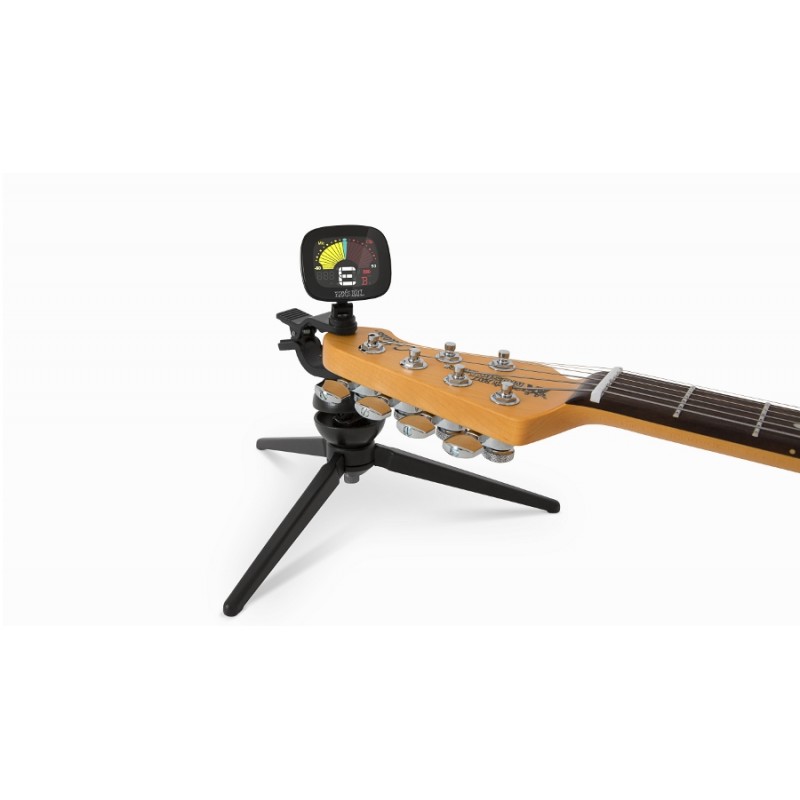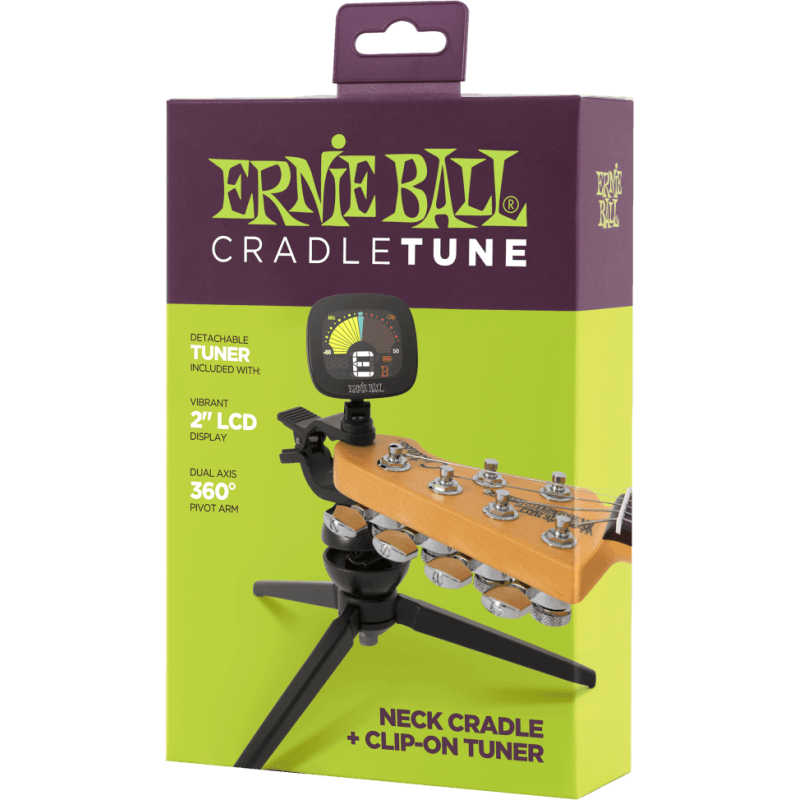 Le CradleTune de chez Ernie Ball est un accordeur à pince sur trépied conçu pour être simple a utiliser avec avec son support repose manche et son grand écran monté sur un bras articulé orientable à 360°.
