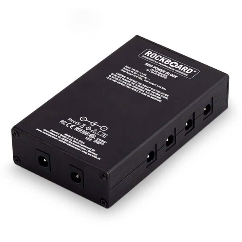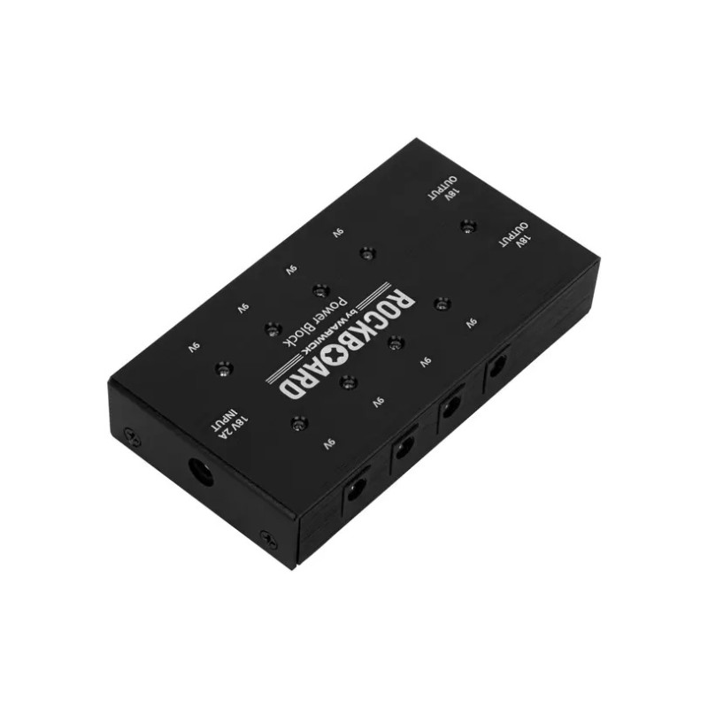 Le Power Block de RockBoard est une alimentation compacte et ultra légère qui est capable d'alimenter jusqu'à 10 pédales d'effets. Outre ses 8 sorties 9V (Max 150 mA chacune), il propose aussi 2 sorties 18V (400mA). Cette alimentation produit 2000 mA maximum et est vendue avec tous les câbles.