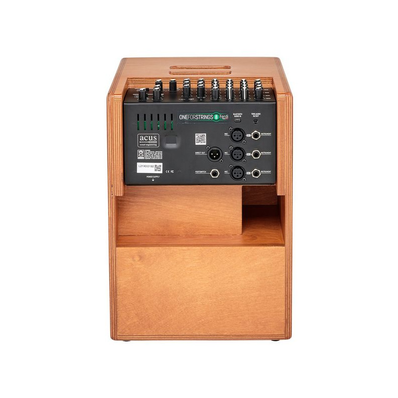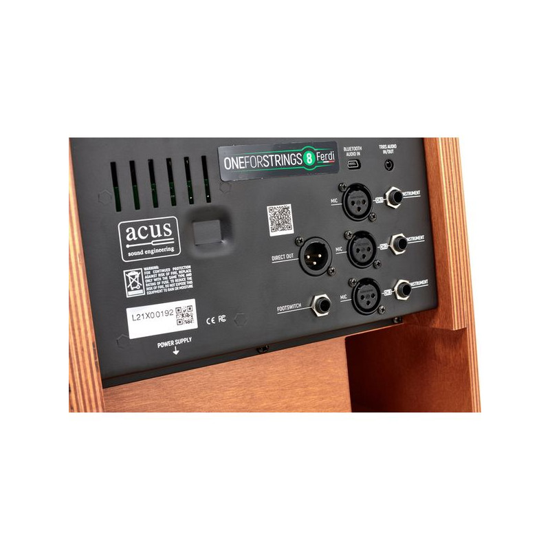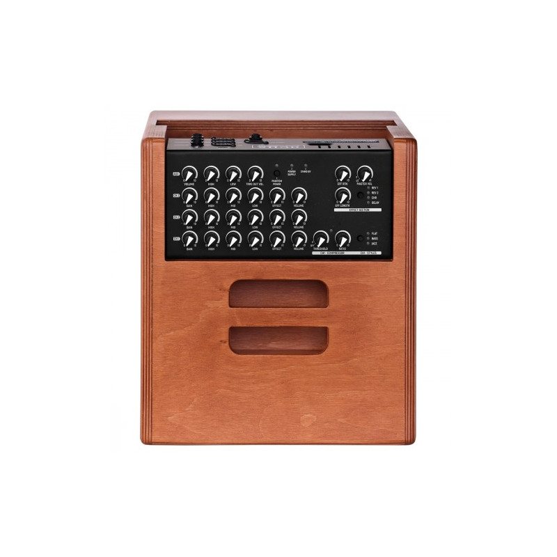 Ampli acoustique bi-amplifié, Boomer 8'', Tweeter 1", 3 canaux pour instruments et micros, Réglage Volume (avec StandBy), Alim Phantom 24V, EQ, Effet Reverb 1 et 2 – Chorus - Delay, Réglage Retour et longueur d’effets, Entrée Bluetooth, Contrôles additionnels : Compression (Seuil, ratio), Environnement (flat, Jazz, Bass), Sortie direct XLR et Entrée/Sortie TRRS avec master, Entrée Pédale, Puissance Max 140W avec alimentation externe 24V DC, SPL Max 106dB, Fourni avec Alimentation et carte bluetooth, 10.4kg, Finition Wood. Hauteur : 384mm, Largeur : 277mm, profondeur : 310mm.