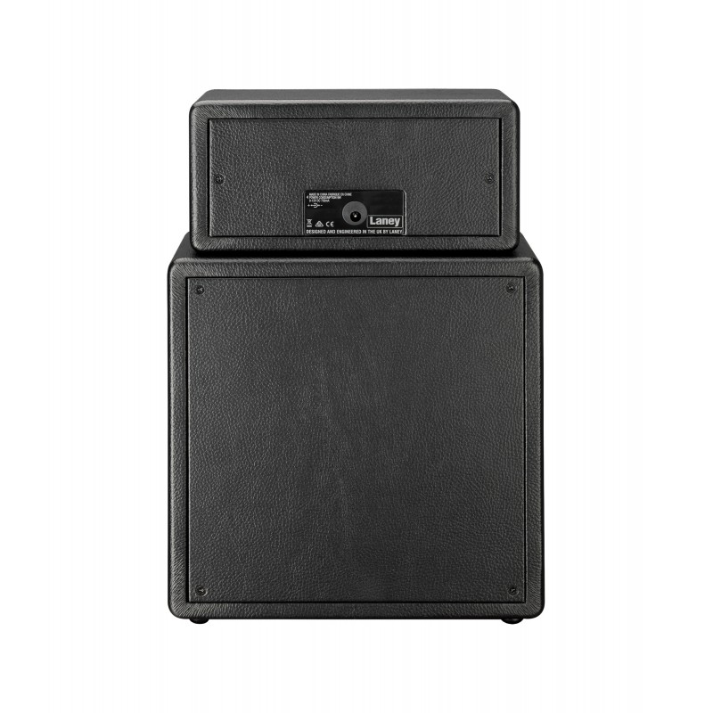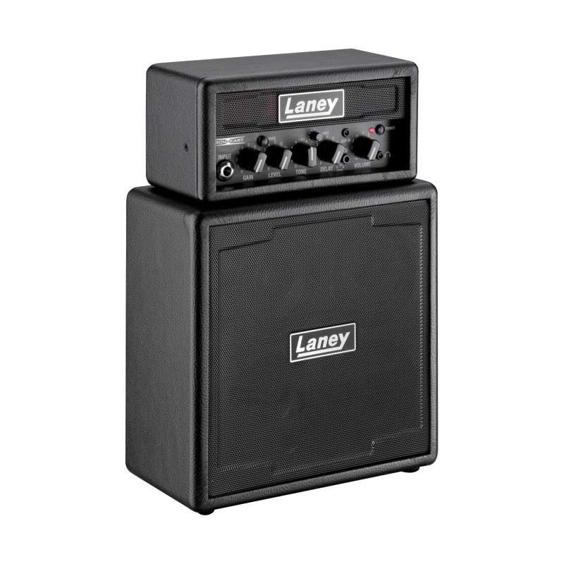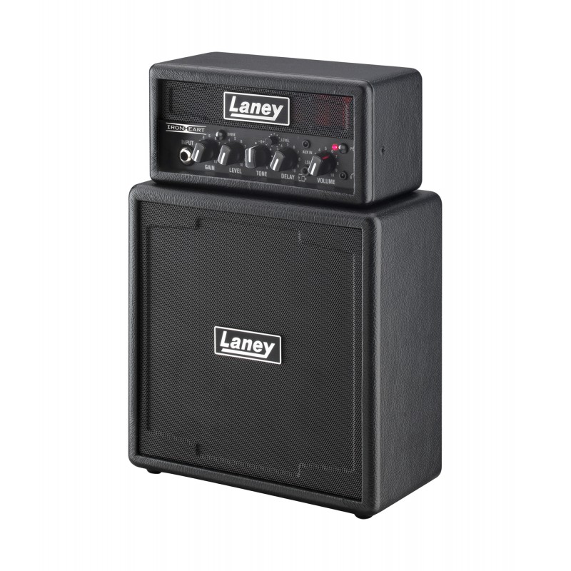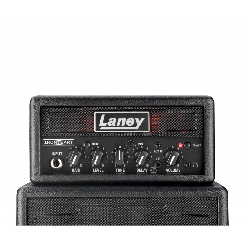 Ampli guitare MINISTACK-IRON stéréo 2x 3W, look Ironheart, 4 x HP 3", 2 canaux, Gain, Drive, Level, Tone, Delay, entrée auxiliaire, connectique LSI (Laney Smartphone Insert) avec câble inclus, alimentation sur 6 piles AA (non fournies) ou par adaptateur secteur optionnel, dimensions: 29.5 x 20.5 x 10.5 cm, poids: 2.6 kg.