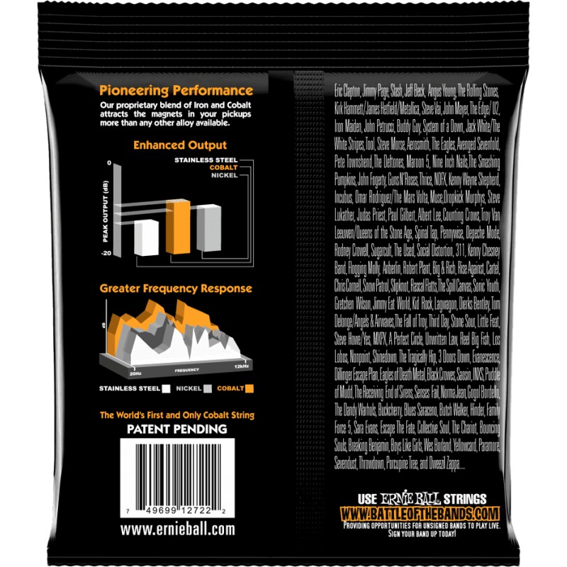 Ils ont choisi Ernie Ball : Ernie Ball est la première société à avoir proposé des cordes au détail et a depuis mis en place les standards des cordes de guitare. La liste des utilisateurs de renom n'a cessé de s'agrandir au fil des années parmi lesquels : Jimmy Page, Eric Clapton, John Mayer, Chris Cornel, Eagles, Maroon 5, Counting Crows, Budy Guy, Aerosmith et bien d'autres... êt principal du Cobalt est son attraction magnétique qui est plus forte que celle des alliages à base de fer ou de nickel.
