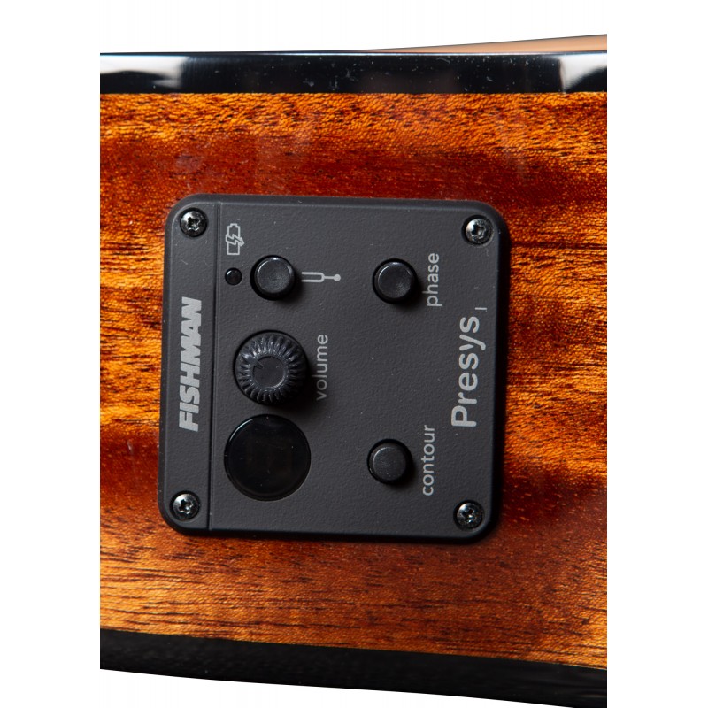 table cèdre rouge massif, fond & éclisses acajou, manche acajou, sillet 48 mm, touche & chevalet ovangkol, incrustations"centered dots", rosace tortoise, binding noir, sillets PPS, mécaniques nickelées, Fishman Presys I.
