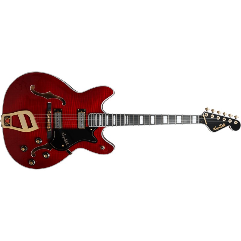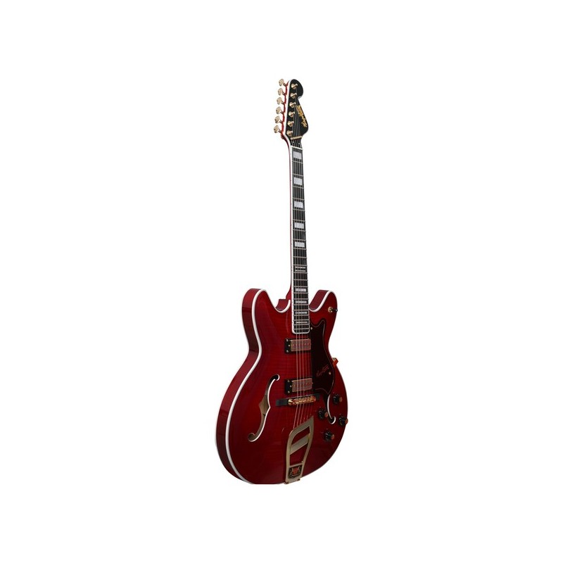 67 'Viking - Réédition du modèle Viking original de 1967, alias le modèle Elvis´. Cerisier sauvage transparent, table en érable flammé, corps en érable F-Hole, manche boulonné en érable, TOM à longue portée, chevalet Trapèze Hagstrom, micros: 2 x H-67, tige de renfort H-Expander, accordeurs Hagstrom 18: 1, touche en résine