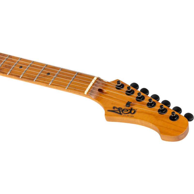 Outre la qualité du son, la facilité de jeu ne doit pas être négligée. C'est pourquoi JET Guitars a choisi un manche en érable avec un profil en C moderne. La touche est en érable grillé, une variante plus stable de ce type de bois. Grâce au rayon traditionnel de 9,5 pouces de la touche, la JS500 donne immédiatement une impression de familiarité. En outre, les 24 frettes sont facilement accessibles, car le talon est joliment arrondi. En résumé, le rapport qualité-prix de cette JET Guitars JS500 est excellent.