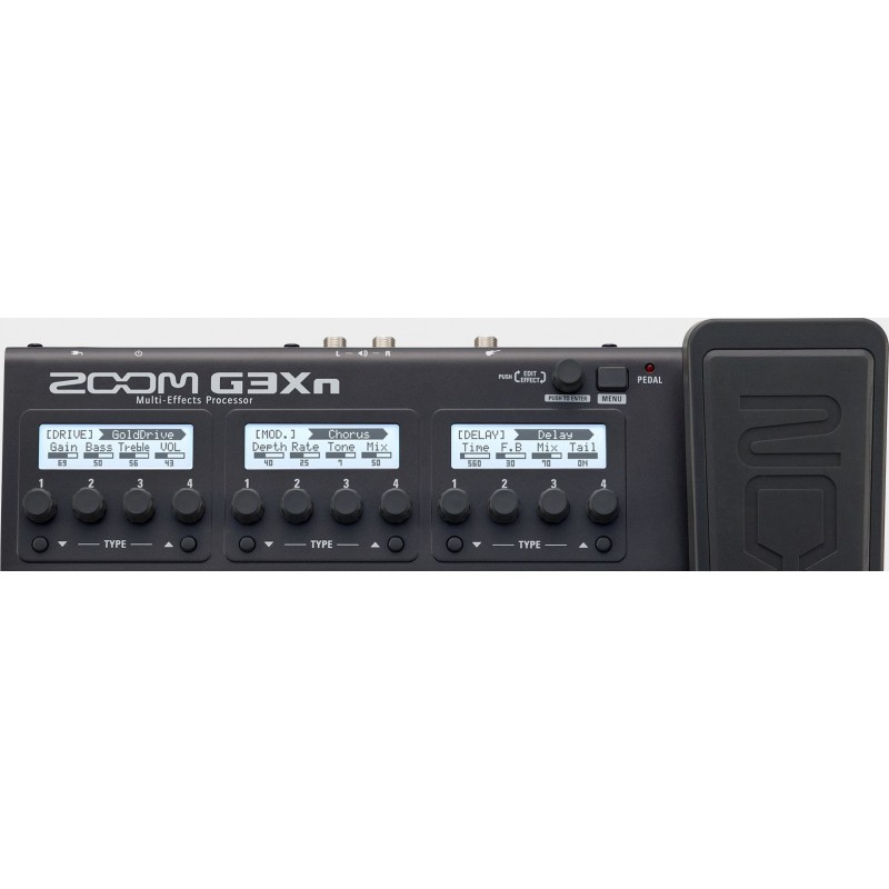 Les commutateurs et boutons du G3Xn vous procurent un meilleur contrôle, tout en offrant les sensations pratiques et la réactivité d’une pédale d’effet standard. Le G3Xn réunit trois écrans ACL pour afficher en un coup d’œil la totalité des chaînes d’effets, ce qui facilite l’ajout, la suppression ou le changement rapide de l’ordre des effets. De plus, vous pouvez mémoriser jusqu’à 150 chaînes d’effets personnelles sous forme de sonorités.