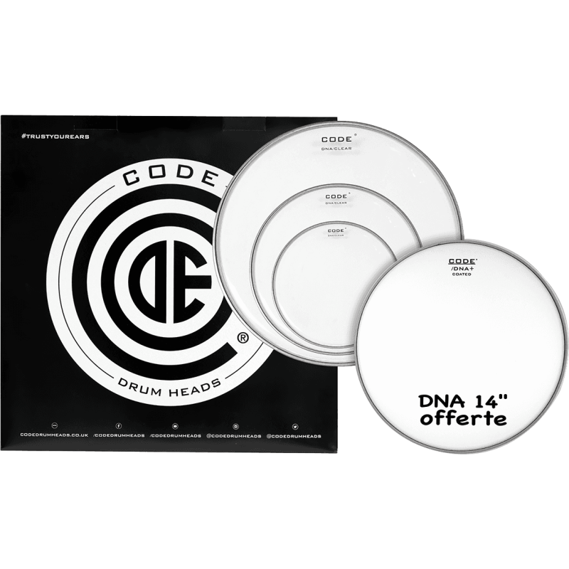 Dédiée aux toms ou aux peaux de résonnance, la DNA Clear procure une attaque franche et profonde ainsi qu’un son très ouvert qui donnera une longue résonnance entre les médiums et les graves. Ce pack est composé d'une peau de 10", 12" et 16" ainsi qu'une peau de caisse claire offerte en DNA coated 14" !