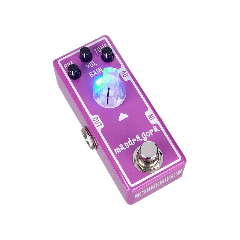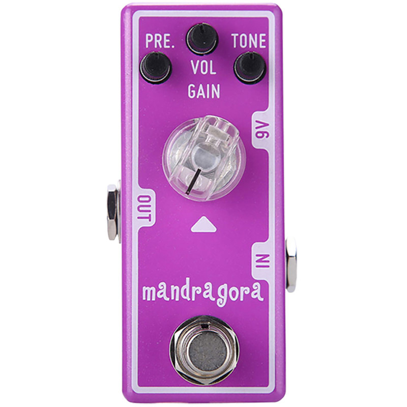 La Mandrogora possède deux contrôles de tonalité qui vous permettront de façonner votre overdrive en fonction des spécificités de votre guitare et de votre plateforme. Le bouton VOL contrôle la quantité de signal et le bouton Gain contrôle le niveau d'overdrive. Cette overdrive super douce vous permet d'avoir des aigus contrôlables, donc plus de pétillement dans les aigus ou d'aigus indésirables. Juste des aigus doux et sucrés qui chantent. Le bouton PRE. vous permet d'augmenter les aigus sans couper les basses, et vous permet également d'adapter le son de vos lecteurs à différents amplificateurs. Le bouton Tone vous permet d'adoucir le contenu des aigus. Il s'agit d'un overdrive à haut gain qui peut garder un bon remplissage de son. Plein d'harmoniques, convient au blues et au rock.