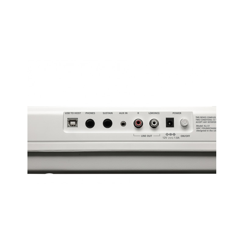 Échantillon de son KORE 1.0 (128MB), Voix 16, Mode d'exécution Couche, Split, Duo, Transposition complète vers n'importe quelle tonalité, ± 1 octave, Accordeur ± 100 cents, Enregistrement 1 piste, 1 morceau, Métronome Démarrage, arrêt, sélection de la signature temporelle, contrôle du tempo, contrôle du volume, Effet Réverbération, Chorus, EQ (basses, aigus), Démo 8 morceaux, USB MIDI (16 canaux) / Audio, Entrée/sortie auxiliaire Entrée auxiliaire 1/4" (stéréo), Sortie ligne RCA (stéréo), Sortie casque 1/4 (Stéréo), Entrée pédale Sustain (pédale de commutation incluse), Amplificateur 2x15W, Haut-parleurs 4 haut-parleurs (2 woofer / 2 tweeter), Alimentation externe 12V 2.0A - Piles (6 piles alcalines D).