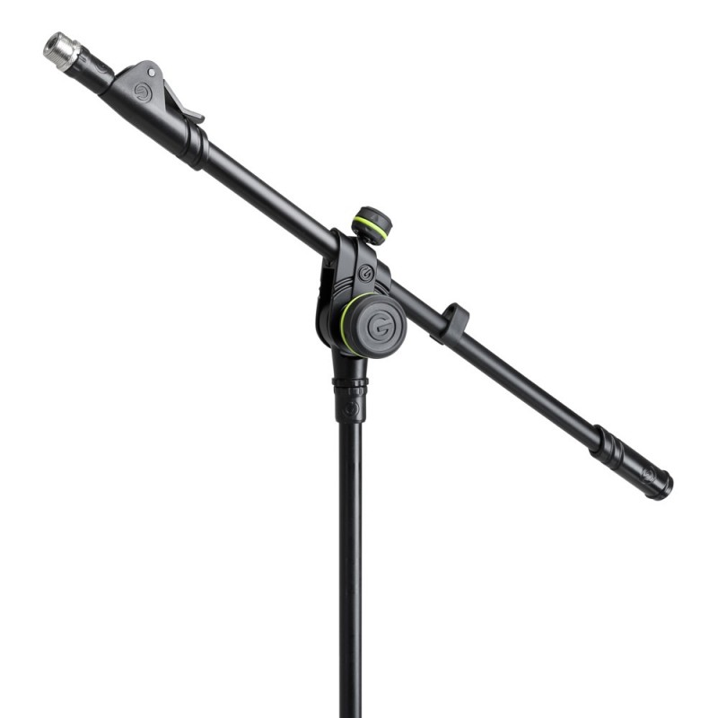 Pied de micro court avec perchette télescopique haut de gamme, embase trépied lourd, hauteur ajustable en 2 points de 1030 1690 mm, socle et bras en zinc moulé ajustable de 880 mm de long. Du matériel travail par des professionnels, pour des professionnels !