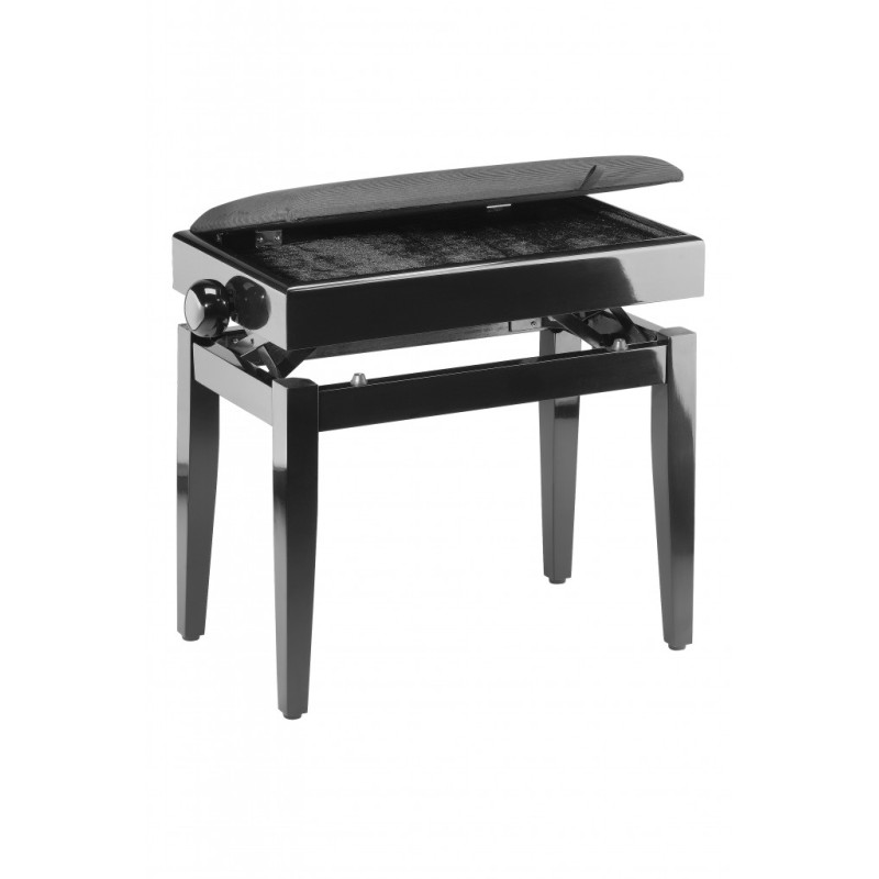 Banquette de piano, couleur noir brillant, compartiment pour partitions, pelote en velours anti-feu