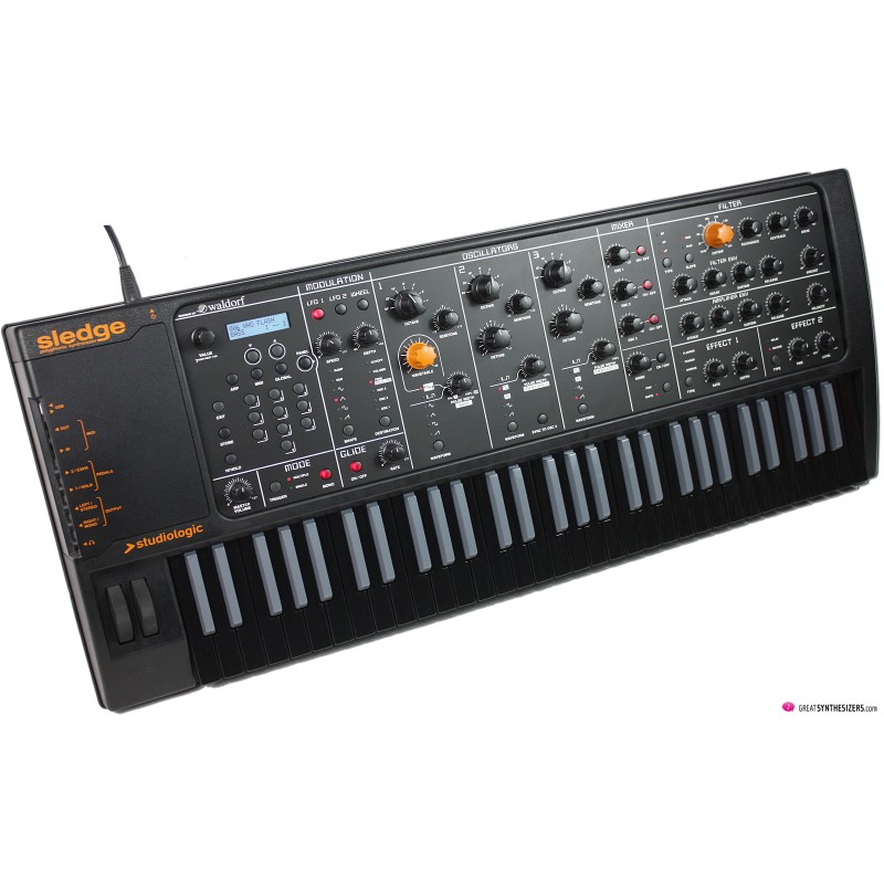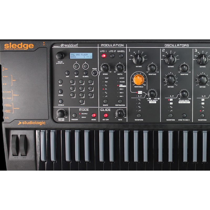De plus le Sledge utilise toujours son puissant moteur de synthèse (3 oscillateurs avec table d’ondes sur OSC1) issu de la collaboration avec Waldorf, le panneau de contrôle clair et accessible, la polyphonie 24 notes, la multi-timbralité, la lecture d’échantillons sur OSC1, transférables et éditables depuis votre ordinateur avec le logiciel gratuit SLEDGE SPECTRE...