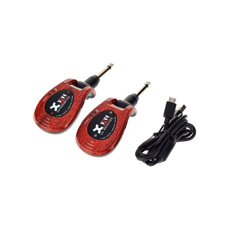 Système sans-fil pour guitare U2, émetteur et récepteur rechargeables fonctionnant sur la bande de fréquence 2.4 GHz, conversion A/D 24-bit, transmission numérique non compressée, 4 canaux, portée supérieure à 30 m, réponse en fréquence: 20Hz à 20 kHz, latence inférieure à 6 ms, plage dynamique supérieure à 103 dB, environ 5 heures d'autonomie, câble USB inclus.