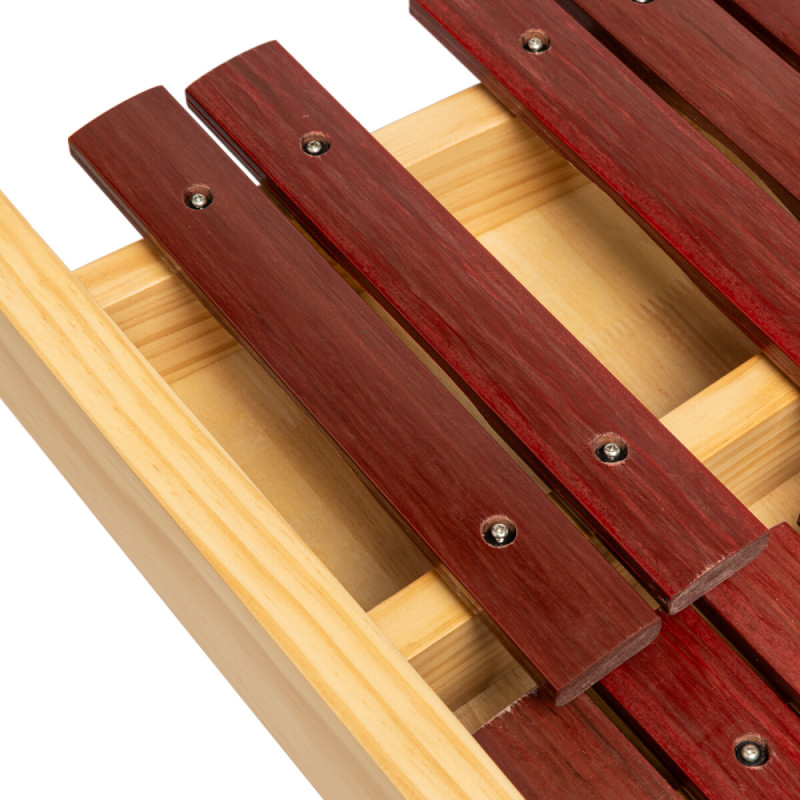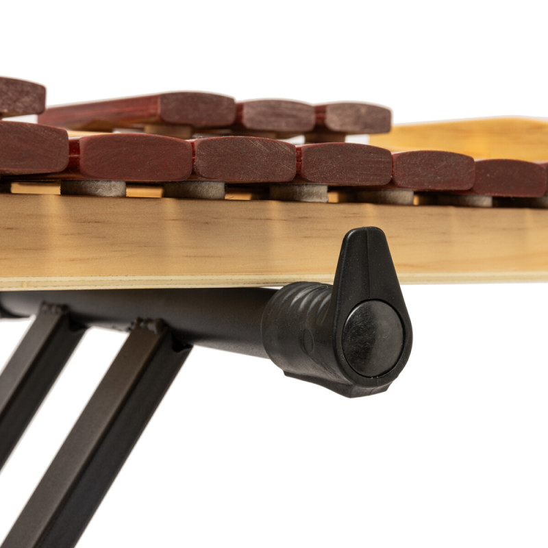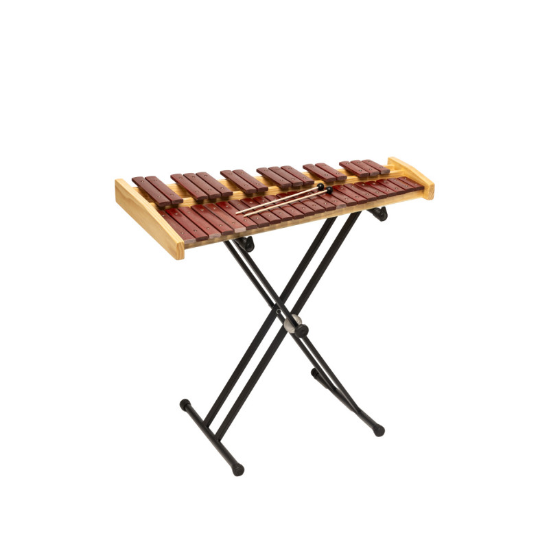 - Tessiture: 3 octaves (Do5 - Do8)- Diapason: La = 442 Hz- Système: Lames fixées par des vis avec panneau inférieur résonant- Matériau: Lames synthétiques avec cadre en bois de finition noire- Dimensions du cadre (L x l x h max.): 102 x 53 x 8 cm- Longueur des lames: 11 - 29 cm- Largeur x hauteur des lames: 38 x 14 mm- Support: Double support réglable en forme de x pour usage intensif- Poids net: 17 kg- Inclus: Paire de mailloches, housse en nylon noir rembourrée avec poignée et courroies dorsales.