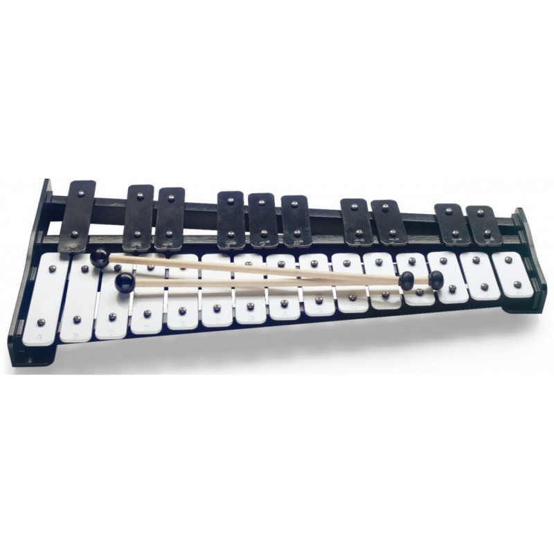 Métallophone de 25 lames, avec housse- Matière: Acier (lames) - Notes: 2 octaves (de la à la, chromatique)- Dimensions 58 x 30 cm- Livré avec: Deux mailloches en bois et une housse- Poids: 2,7 kg